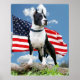 En stolt svart- och vit Pit-tjur (American Stafford Terrier) framför ett vävt amerikanskt flagga och blå himmel.