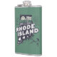 Hip flask har en retro stil pittoreska Rhode Island scen i en statlig formad silhuett.