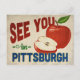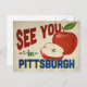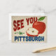 Ett charmerande vykort från Pittsburgh Pennsylvania vintage resor med ett underbart rött äpple, tillsammans med texten från roligt retro stil där det står: "Vi ses i Pittsburgh"