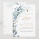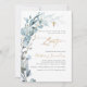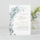 PixDezines Dopnamnsinbjudan med akvarell dammig blå eukalyptus, ett falskt guldkors, guldstoft och ram accentuerad med lyxig kalligrafi. Alla element är redigerbara och borttagbara.