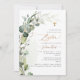 PixDezines Dopinbjudan med akvarell frodig grön eukalyptus, ett falskt guldkors, guldstoft och ram accentuerad med lyxig kalligrafi skrift. Alla element är redigerbara och borttagbara.
