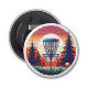 En illustration av en skivgolfbana med basket, gräs träd och solnedgång i ett 8-bitars bildspel i stil.