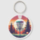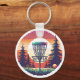En illustration av en skivgolfbana med basket, gräs träd och solnedgång i ett 8-bitars bildspel i stil.