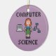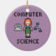 Illustration i 8-bitars stil som skildrar en kvinnlig datorforskare, en dator och ett fluxogram.