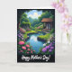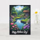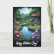 Det här kortet visar en pixelstilad trädgårdsscen med en mjukt svängd bäck i djupblått som fångar små ljusfläckar när den slingrar sig genom ljust grönt gräs kantat av små grå stenar. Längs båda stränderna trängs täta blommor i rosa, lila och vitt samman, och sättet de lutar sig mot vattnet på känns som en tyst, omtänksam gest ❤️. I mellangrunden sitter en öppen paviljong med tak av varmt brunt tegel och enkla träpålar nära bäcken, som en lugn plats där någon kan stanna till och dela ett mjukt leende 👩. På andra sidan vattnet löper en gammal stenmur bakom växterna, delvis täckt av frodig grön murgröna som hänger ner i skiktade flikar. Himmelen är blekblå med luddiga, pixelartade vita moln, och den övergripande belysningen antyder ett klart, mjukt dagsljus. Meddelandet “