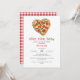 Den här lekande och unika inbjudan till babydusch har en roligt pizzaemat som är centrerad kring en hjärtformad illustration av traditionell ost, tomat och basilipizza överst, parad med vismisk grönt och röd typografi som lyder "segment, segment, baby". Utformningen framkallar den mysiga känslan av en klassisk italiensk pizzeria. Kortets baksida har en röd och vit gingham mönster som påminner om traditionella borddukar och som ökar den tematiska sammanhållningen. Perfekt för matälskande eller italienska föräldrar, eller en avslappnad firande, kombinerar den här pizzatemedda babyduschen rustik charm med en modern, humoristisk twist. Perfekt för blivande föräldrar som kärlek pizza, italiensk mat, eller vill ha en avslappnad och roligt babydusch. Finns som tryckta kort eller en snabb digital nedladdning.