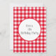 Rött och vitt styrt med mer information att lägga till på baksidan. På framsidan visas en pizza paj med alla putsbitar. Underbar för en födelsedagsfirande.