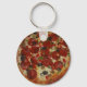 En pizza med pepperoni, oliver och paprika som bär på nycklar.