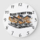 Den här cirkulära väggklockan visar fem tecknader pizzasekar, var och en med ett basebolllock och skor, som firar ovanpå en pizza. Uttrycket "SLICE TO MEET you" visas i svart överst. Bakgrunden är vit.