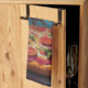 En stor pizza med pulserande pepperoni-skivor och grönt ställs framför en Eiffel Torn-struktur, med ett stort solnedfall i himmel och berg i bakgrunden. Bright, vismisk färg skapar en surrealistisk och fantastisk scen som förenar natur och kulinariska konst.