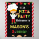 Pizza hälsar party välkommet och Pizza lagar party. Det här Pizza-välkomsttecknet från party är perfekt att välkomna era gäster i Pizza skapar party eller italienska party! Cute party-skylt för unga kockers födelsedagsfest med rödhårigets kock och lite matlagningsutrustning. Du kan bara redigera den här mallen som är enkel att använda på menyn Anpassa för att göra den speciell.