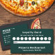 För din pizzeria-restaurang, mat-lastbil, hemleverans av mat eller matkock blir det här klassens förmånskort perfekt. Den levereras med en halv Margherita-pizza placerad på ett träfat och anpassade som dekoreras med ikoner på mörk grönt bakgrund. Du kan distribuera dem till dina kunder för att bygga lojalitet. Den här komen med 9 tomma cirklar för 10:e gratis.