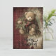 Send heartfelt holiday cheer with this cozy Christmas card featuring a plush teddy bear wrapped in a red-and-green plaid scarf, seated beside a festive bouquet of holly leaves and berries. Set against a vintage-style background with faded script and a red plaid pattern, the elegant black “Merry Christmas” lettering adds a timeless touch. Perfect for sharing warmth, comfort, and classic seasonal charm.