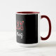 The word “MERRY” bursts across a black background in bold red and black plaid lettering, with a playful Santa hat perched atop the letter “E.” Beneath it, “Christmas” appears in elegant white cursive, adding a touch of seasonal warmth. The red interior of the mug enhances the festive contrast, making the design pop with holiday energy. This cheerful layout blends rustic charm with whimsical flair, perfect for celebrating the joy and tradition of Christmas in a bold, personalized way.