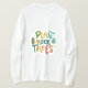 En livfull bakgrund för grönten med texten "Plant more Träd" i fet, färglöst brev. En enkel kontur av träd ligger i hörnet.