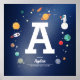 Söt personlig monogramaffisch i marinblå med diverse rymdobjekt. Du kan enkelt flytta alla objekt (eller ändra bokstavsstorlek) i redigeringsverktyget.