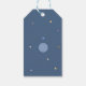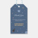 En rymdtematiserad födelsedag tacktagg med planeter, stjärnor och en raket i tecknad stil på en blå bakgrund. Du kan enkelt använda den för att tacka gäster på en fest eller för någon present du kommer att göra!