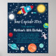 Skapar en tidskapsel är en roligt-födelsedagsaktivitet som blir en tidlös skattad keepsaké. Visning bara tecknet och korten på ett bord så att gästerna kan skriva sina prognoser för framtiden, önskemål eller vilket budskap de vill ha. Tidskapskortet öppnas på ditt barns artonde födelsedag, eller vilket år som helst som du vill. Den här fina designen har astronaut, raketanslutning, frakt, planeter och stjärnbakgrund.