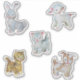 Vintage av leksak-klistermärken av plast. Bunny, kattunge, lamm, valp och tiger.