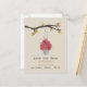 En utomhus höstbröllop spara datumet vykort med en illustration av en plåtburk fylld med röda blommor som hänger från en trädgren med höstlöv. Anpassa texten med din information.