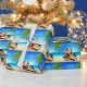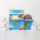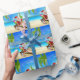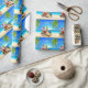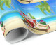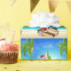 Julillustrationen av sommaren Santa som kopplar av in på stranden under ett kokosnötträd med surfa, stiger ombord, stiger ombord bläddrar gåvasäcken och annan helgdagobjekt med en drink och att ha på sig kort och misslyckandesandals.