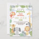Platt 1:a födelsedag-inbjudan som dekorerats med platt bilder av söta djur och grönt löv. En charmig lejon unge, leopard, baby, elefant, giraffe, zebra och apa kommer att dekorera din baby helgdag.