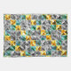 Svinda, guld och grått nedfläckad fyrkanter och tvärgående linjer som bildar vissa trianglar och rand med präglat skuren skaka.