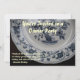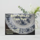 En avslappnad blå och vit middagsplatta är bakgrunden till middagsinbjudan.