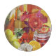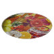 Glasstyckningsdel i rund form till ost eller i pub för citroner och limpor. Fin kulinär design i levande gult och orangar med vin, ost och burk av frukt. Det här är en underbar gåva till bröllopsfesten, brudgummar eller marskalkar, värdinna eller för dig själv. Konstruktion efter artist, Robin Frazier.