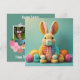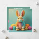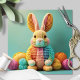A soft, playful, cuddly knitted bunny in pastel colors with tiny yarn eggs, perfect for Easter greeting cards and spring holiday decor. The design is charming and plush, with a handmade feel and bright, warm, friendly appeal.