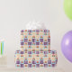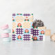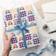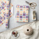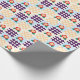A seamless grid pattern combining stylized flowers, checker textures, and bold hash-like shapes in soft cream, blue, red, green, and purple tones.