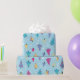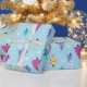 A vibrant and playful pattern of geometric Christmas trees with hearts, dots, and stripes on a snowy blue background. Perfect for modern holiday decor and products.