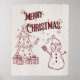 A cute, playful doodle like illustration of a snowman in front of a Christmas Tree, surrounded by ornaments and gifts.