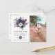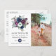 Vita, blå och bordo akvarellrosor och peonblommor bröllop spara datum vykort med elegant typografi kan anpassas till ditt evenemang.