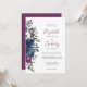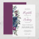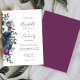 Denna romantiska bröllopsinbjudan har en vattenfärg blommig bukett av plommon lila och marinblå blommor och grönska. Den anpassningsbara texten kombinerar handskrift, kopparplåt och kursiv stil i kolgrå på vit bakgrund. Baksidan är en matchande enfärgad plommon.