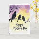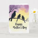 Denna design visar tre silhuetter av mörkfjädrade fåglar som vilar tätt ihop på en smal, knuten gren, med den största till vänster vänd utåt och två mindre fåglar inklämda bredvid den som om de lutade sig intill som nära vänner ❤️. Deras runda, lysande gula ögon ger ett milt, vaksamt uttryck som mjukar upp de mörka formerna. Bakom dem övergår himlen i en jämn, målad tvätt från djupt lila högst upp till varmt orange på mitten, för att sedan blekna till en blekgul färg närmare nederkanten som morgonljus. Tunna, kala kvistar sträcker sig från grenen och ritar fina linjer mot den lysande bakgrunden, vilket ger en tyst, intim stillhet. Under illustrationen sitter en flödande meddelanderad centrerad nära nederkanten, skriven med mörka bokstäver som sticker ut mot den ljusare himlen. Avståndet mellan fåglarna och orden ger en känsla av