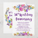Detta plommonlila trädgårds-inbjudningskort för 50-årsjubileum för bröllopet är perfekt för en blomsterfest. Designen har ljust magenta, rosa, plommonlila och blå blommor och en vacker fet skriftstil. Baksidan har en blomsterkrans.