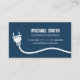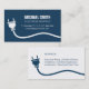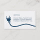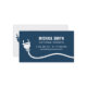 Ett modernt och professionell affärskort med en vit silhuett med en strömkontakt och en tråd över ett mörk blått affärskort. Den är omvänd på kortets baksida. Perfekt för elektriker och för dem som tillhandahåller installationstjänster avseende elektriska ledningar och belysningsanordningar. Anpassa din affärsinformation till de vanliga textmallarna.