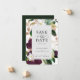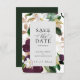 Elegant plum och elfenben blommigt, spara datumet bröllop. Artsy blommigt ram med elfenbensvit och mulberryplommon lila blommor. Lush emerald Greenery accated with golden grenar. Trendig-typografi-designmall som är inställd på mjuk grått ram med koordinering av grönt som stöder färg.
