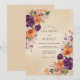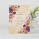 This design features a rich palette of deep plum and burnt orange blooms set against a soft cream watercolor background. Dark purple anemones and terracotta roses are accented by delicate sage green and dusty lavender foliage. This botanical artwork evokes a moody, organic atmosphere perfect for a late season or woodland nuptial event.