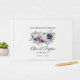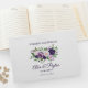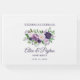 Elegant plum lila och lavender-blommor med grönt bröllop guestbook personlig med namn av bruden och trimmen och deras bröllop-datum.