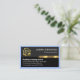 Overleaf, the same design theme is used with card details on the right. On the top is the gold logo followed by your prestigious name, contact details and a slogan caption option.
