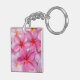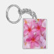 Den akryliska nyckelkedjan visas med ett foto av tropiska plumeriablommor i söt på de hawaiiska öarna.