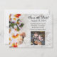 Lägg till ditt foto på detta eleganta "spara datumet" - meddelande! Bröllopsinbjudan Set med en vacker bild av en tropisk lei med Plumeria- och orkidéblommor, liggande i sanden med tre havsskal. Unik och färgrik inbjudan för ett strand-, havs-, kryssnings-, hawaii- eller tropiskt resortbröllop med färska färger i gult, orange, grönt och lila. Bröllopsinbjudan och matchande tillbehörsset. © 2010 www.CustomInvitesOnline.com
