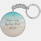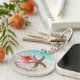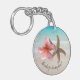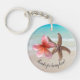 Personligt bröllp nyckelring med tropiskt tema. Rund, dubbla-sidig nyckelring med rosa plumeria och stjärnfisk över en bakgrund på strandscenen. En böjd text vid grund kan säga "tack" till gästerna. Lägg till mer text på baksidan med namn på de nya länkarna, datum för giftermål och plats om du vill.