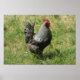 En svart och vit hackad kyckling av rasen Plymouth Sten, som står hög i gräset och njuter av sol.