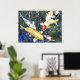 En familj av lysande färgad koi-fisk simma precis under dammens reflekterande yta. Att dansa ljus och briljant blå himmel vattenfärg på scenen. Poster.