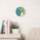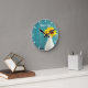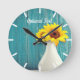 Teckade solblommor över en rostfri, vävd träplank som är målad i havsblått glas.
