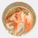 Poetry by Alphonse Mucha. Bleken färg är subducerad och naturlig. Kvinnan, vacker, med långa, blommande hår, är omgiven av ornatblommor. Hon är poesi. Hennes blomning är målad i nyanser av blek blå och grönt som påminner om himlar och marken. Hon vilar på den gyllene bakgrunden som blandas med hennes långa, gyllene hår. Kvinnan tittar ner på landsbygden, sitt huvud krönte med ett lager gren, symboliskt poesi och vinism. Hon verkar vara i besinning när hon blickar ner på jorden, nästan som om hon satt på en sväng högt över jorden. Plötsligt och känslan, när muse följer all aktivitet nedan, inspirerar poeterna som för oss deras ord.