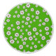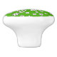 Poignée en céramique amusante et colorée. Tapis vert parsemé de petites fleurs blanches de tailles diverses.